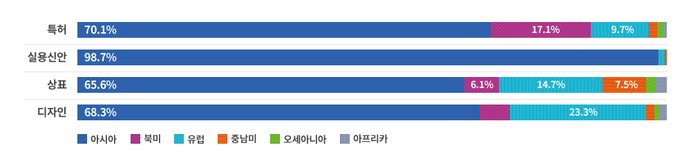 2024년 대륙별 IP 출원 활동 비중: 2024년 아시아 대륙의 IP 주무관청은 전 세계 특허·상표·디자인 출원의 약 65-70%를, 실용신안 출원의 거의 전량(98.7%)을 차지함